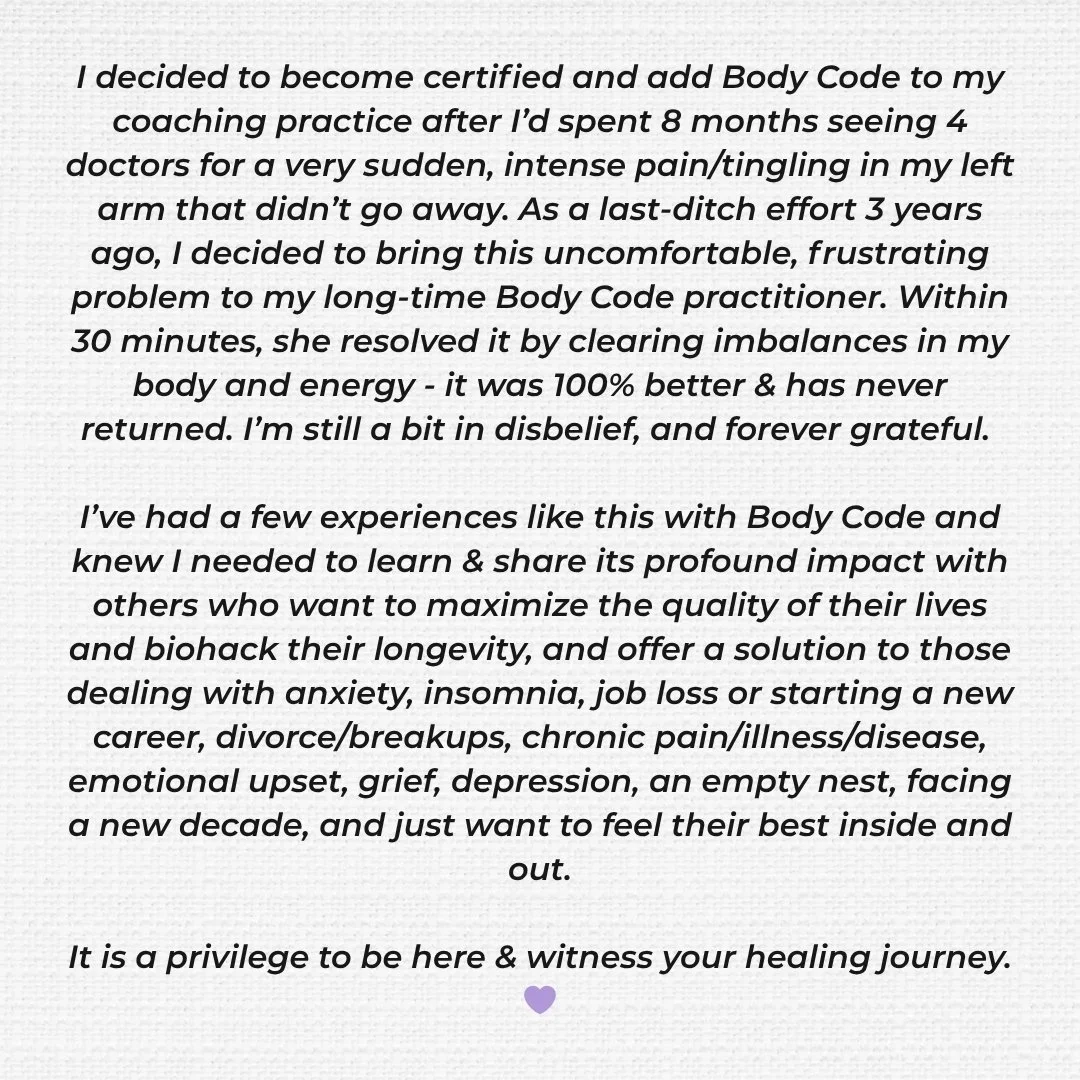 Shannon’s work blends coaching with the most effective, least invasive transformation tools we know of, including the Emotion Code®, Body Code® & Belief Code®. This results-driven framework identifies and clears obstacles holding you back from experiencing your greatest life, potential & success.